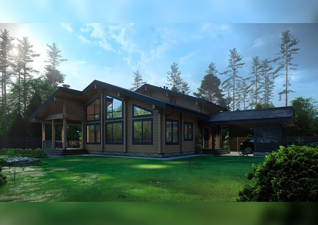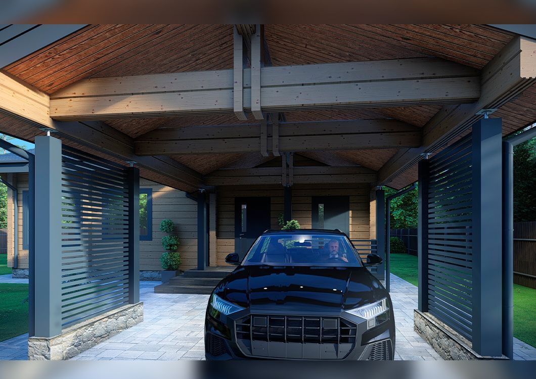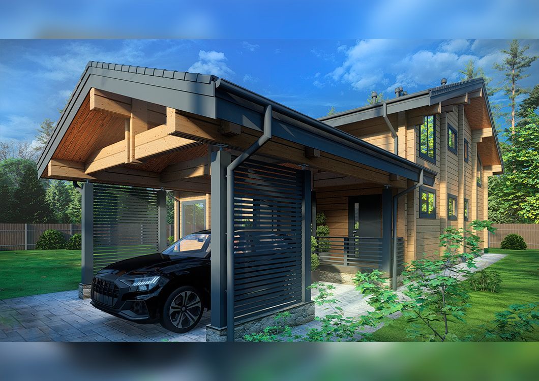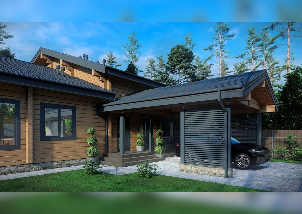 Для большего комфорта в проекте предусмотрен навес для автомобиля в едином дизайне с домом.