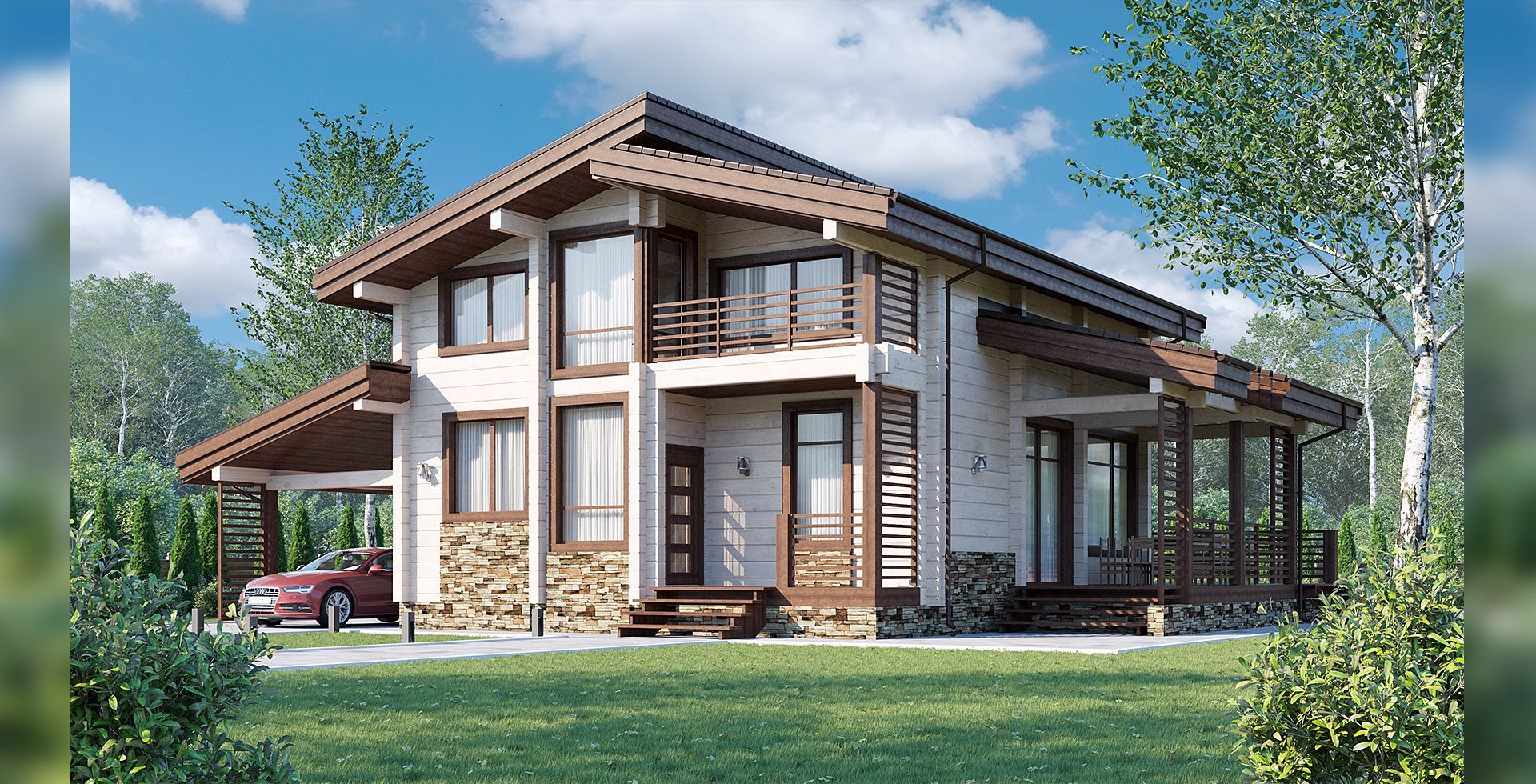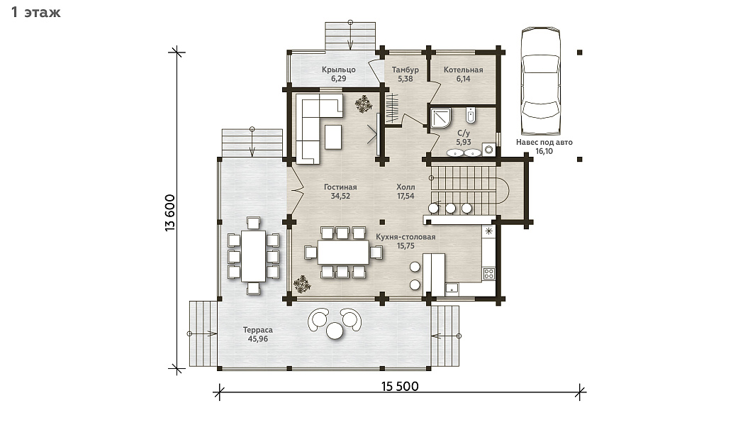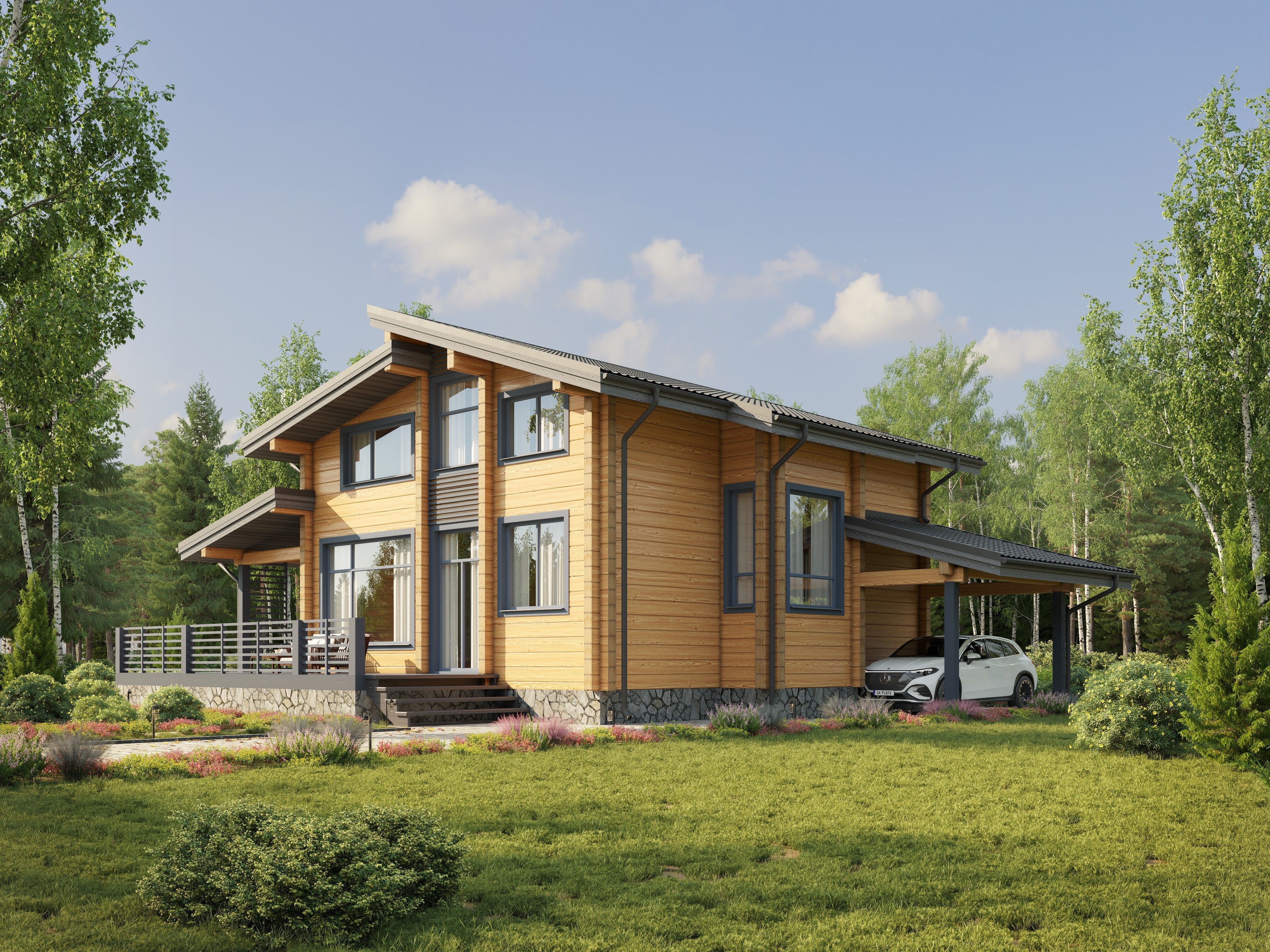 Терраса и балкон станут отличными местами уединиться для работы и отдыха. Возможность попасть на террасу из кухни-гостиной позволяет всегда быть со своими близкими. Сама кухня-гостиная с комфортом вместит всех за общим столом уютными вечерами. Простой и изящный дизайн дома вместе с панорамными окнами создает ощущение простора и свободы. Здесь вы найдете вдохновение для новых идей. С заботой о жильцах спроектировали и гармонично встроенный в дом навес.