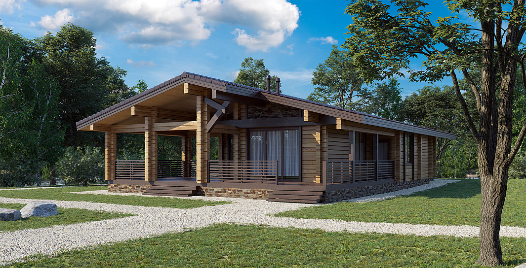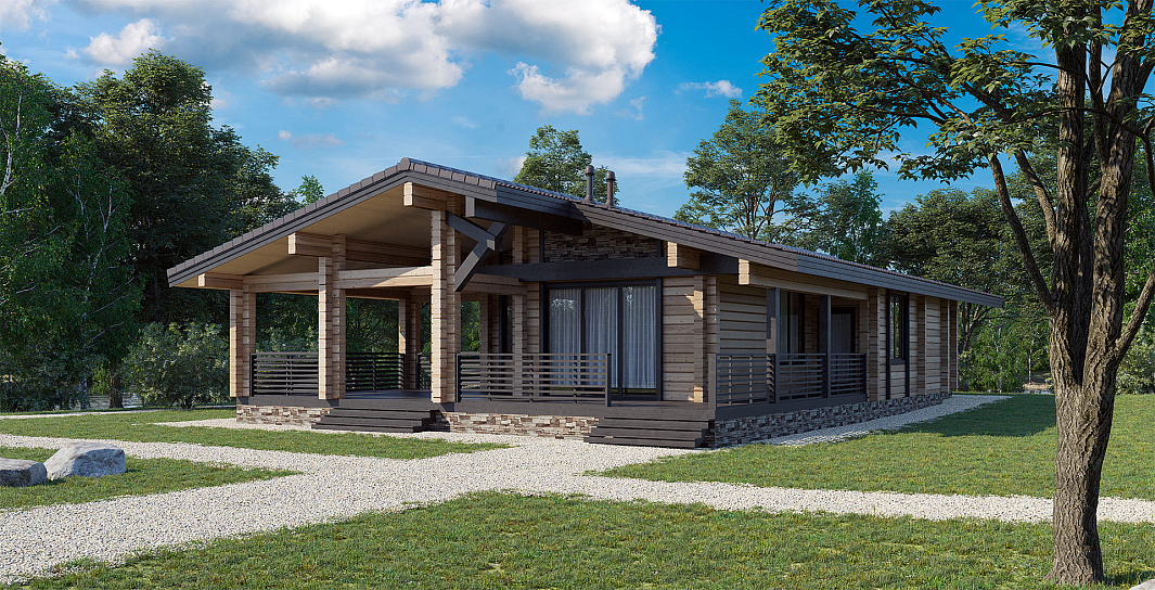Современный стиль создает ощущение простора. Благодаря уникальной архитектуре дом станет частью природы вашего участка. Панорамные окна наполняют дом светом. Интересным решением стала обширная крытая терраса, выход на которую из кухни-гостиной и из спальни. Здесь можно расслабиться или поработать — свежий воздух обеспечит приток идей. В этом доме отлично чувствует себя вся семья.