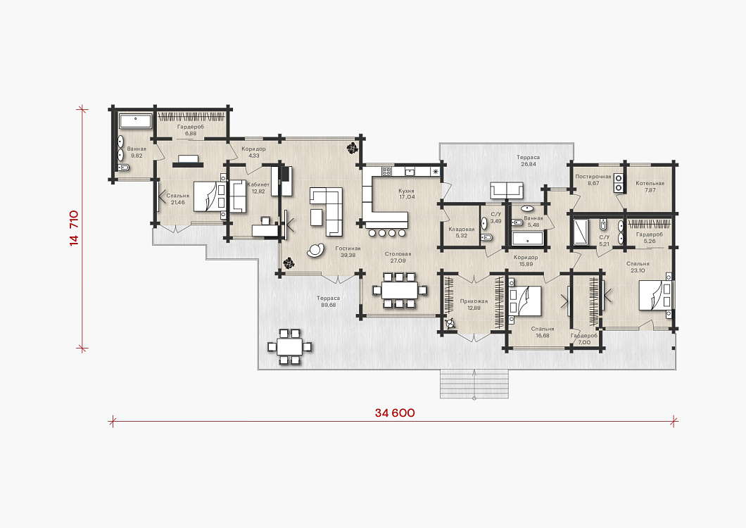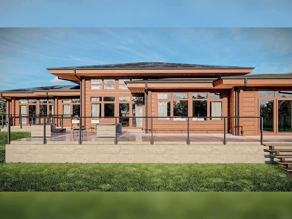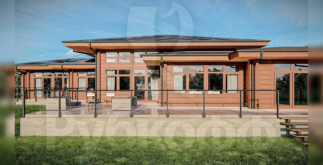Сочетание светлого бруса и темных металлических элементов в оригинальной планировке создают стильное и функциональное пространство. В центре дома расположилась просторная гостиная с выходом на террасу. Поставьте лежаки и удобные кресла и наслаждайтесь солнцем и свежим воздухом. Разместите зону барбекю и наслаждайтесь отдыхом. Просторные мастер-спальни обеспечат возможность расслабиться и насладиться уютом загородной жизни.