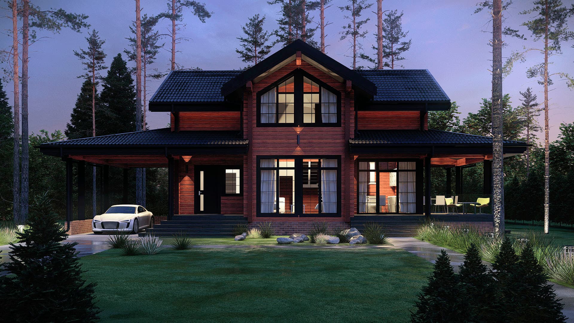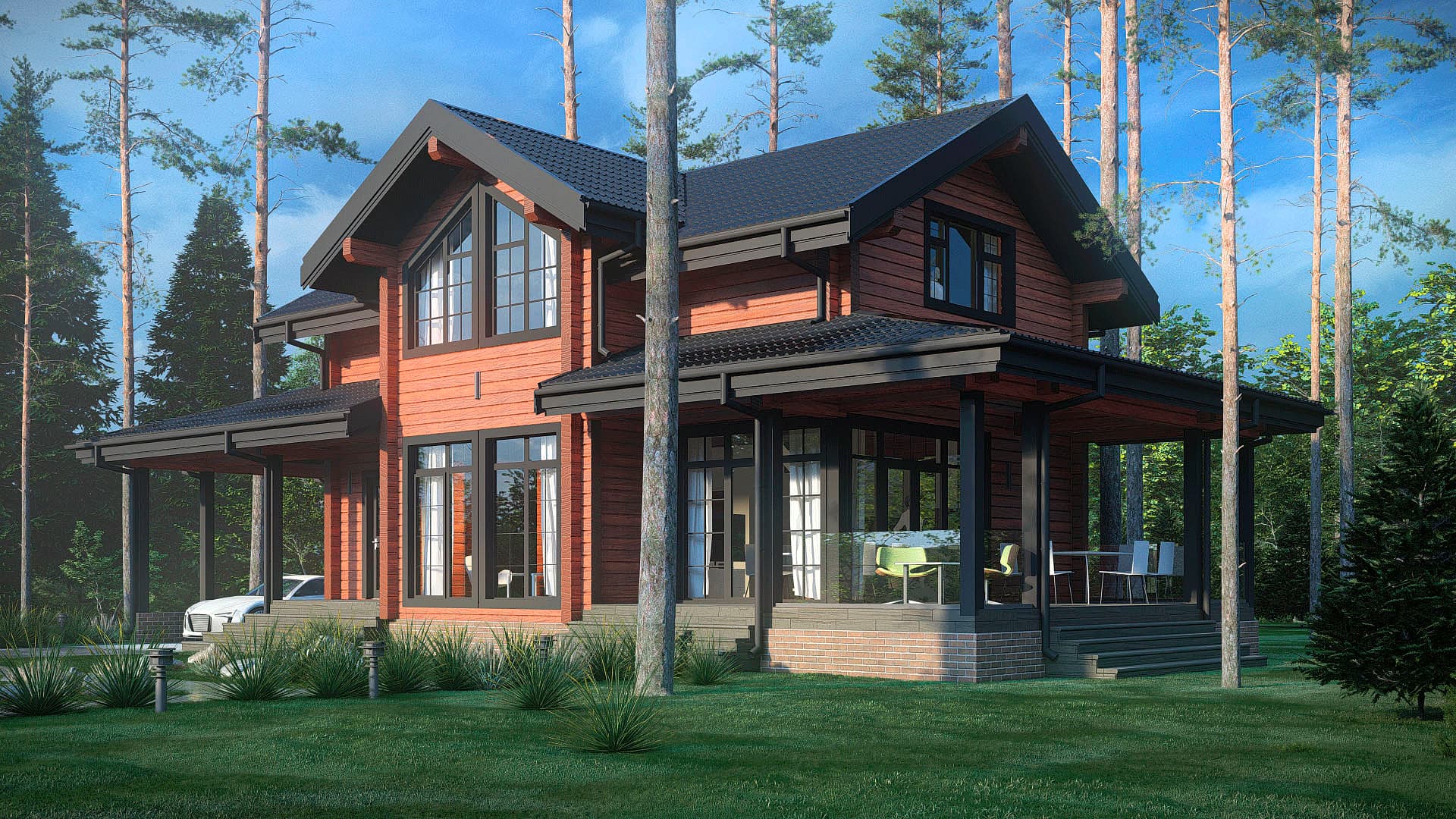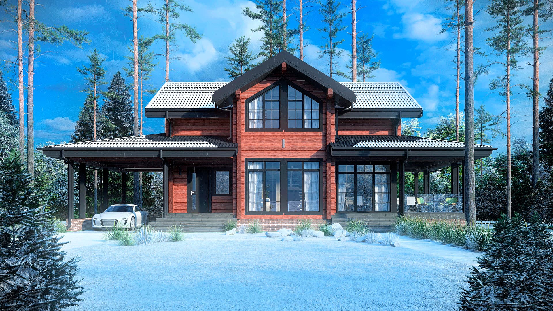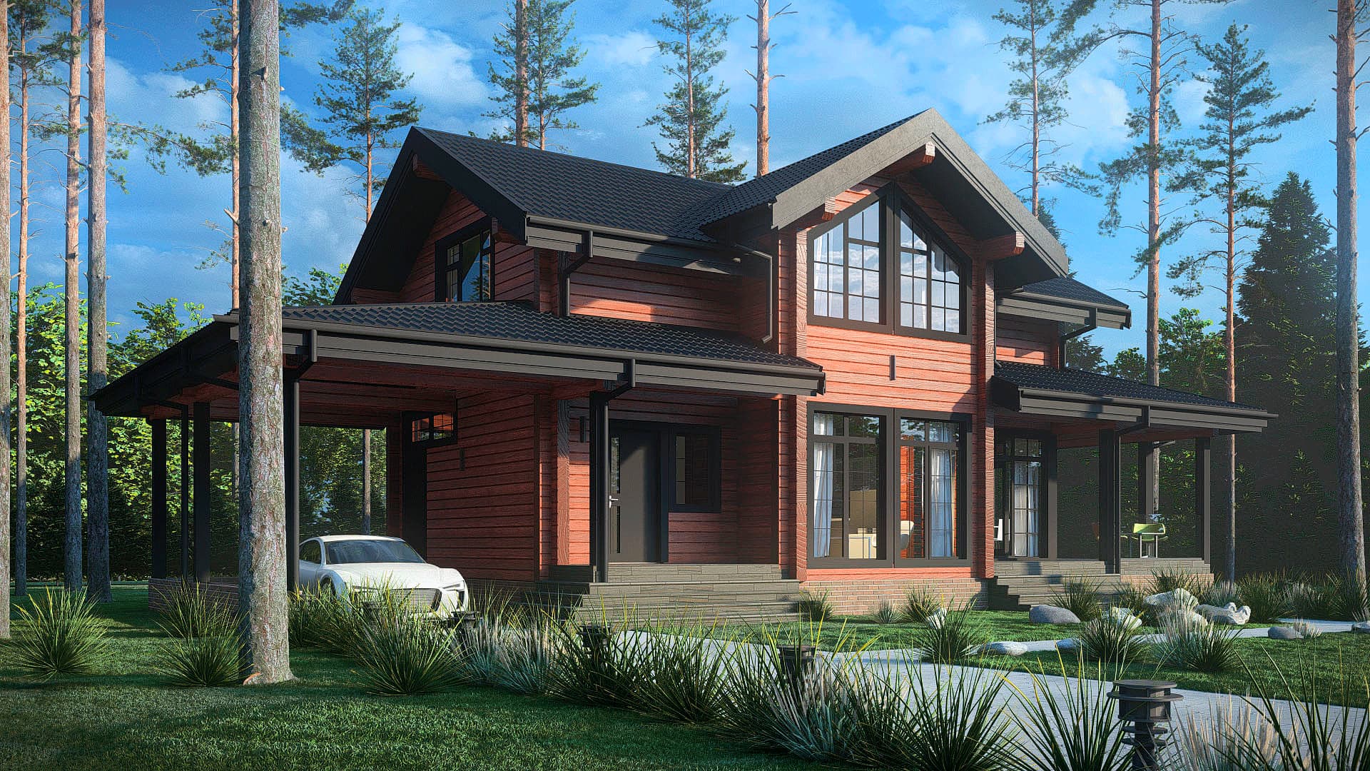 Сочетание акцентных деталей с цветом фасада, сделают дом украшением любого участка. Навес обеспечивает удобное место парковки автомобиля. Открытое пространство кухни и гостинной создано для уютных семейных вечеров и веселых праздников. Продолжить веселье или насладиться тишиной можно на большой террасе. Сауна на первом этаже дополнит загородный отдых.