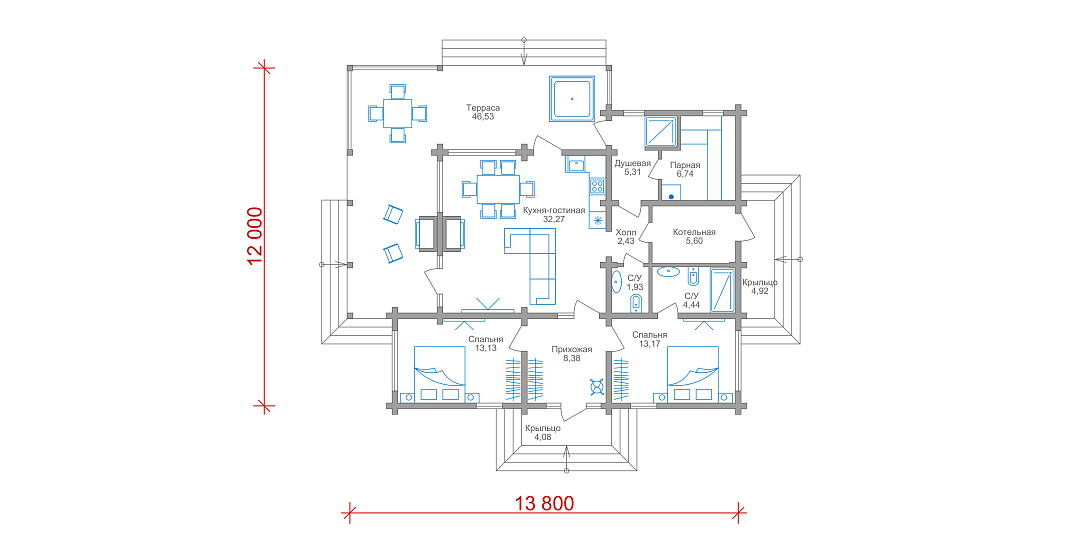 Особое внимание заслуживает зона домашней сауны. Отдельное зонированное пространство для горячих процедур включает: парную, душевую с выходом на террасу, холл, санузел и котельную. Такая планировка обеспечивает приватность и комфорт оздоровительного отдыха, а также доступ к нему в любое удобное для вас время.