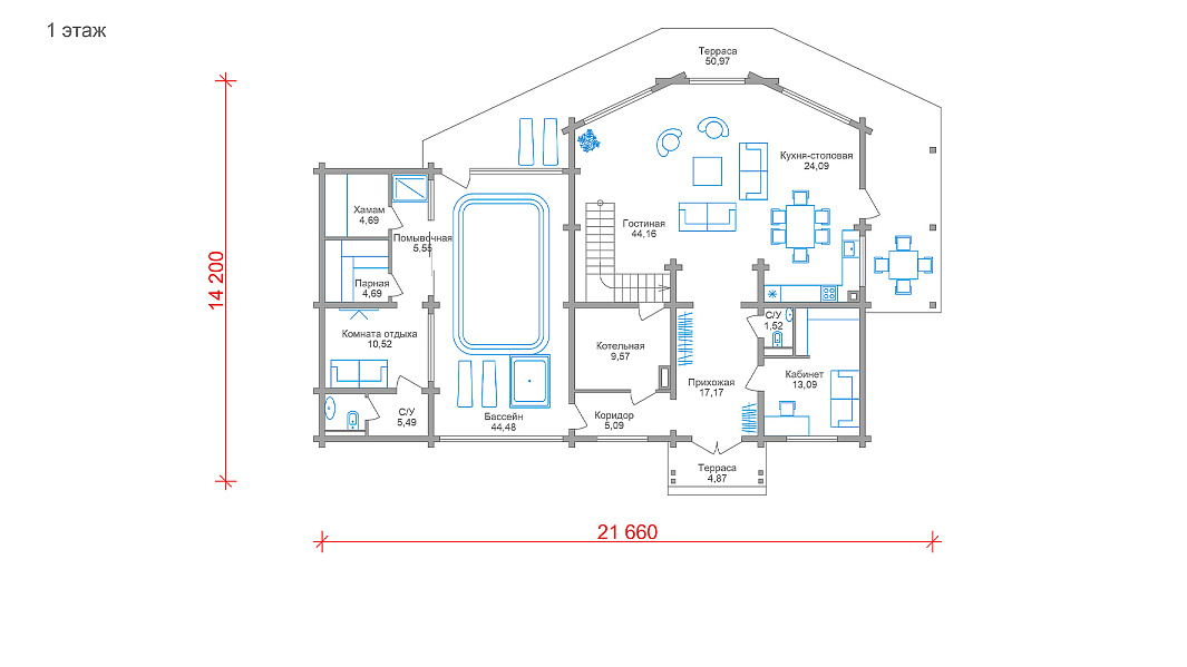 Сочетание светлого дерева и темных элементов внешней отделки подчеркивают стиль и индивидуальность здания. Панорамные окна дополняют дизайн и наполняют пространство светом. На первом этаже расположился бассейн с отдельной парной, баня-хамам с душевой и комната отдыха. Огромное пространство гостиной идеальное место для общения с близкими и друзьями. Выход на террасу обеспечит доступ к шезлонгам. Отдохнув, вы всегда сможете с комфортом вернуться к рабочим вопросам в личном кабинете на первом этаже.