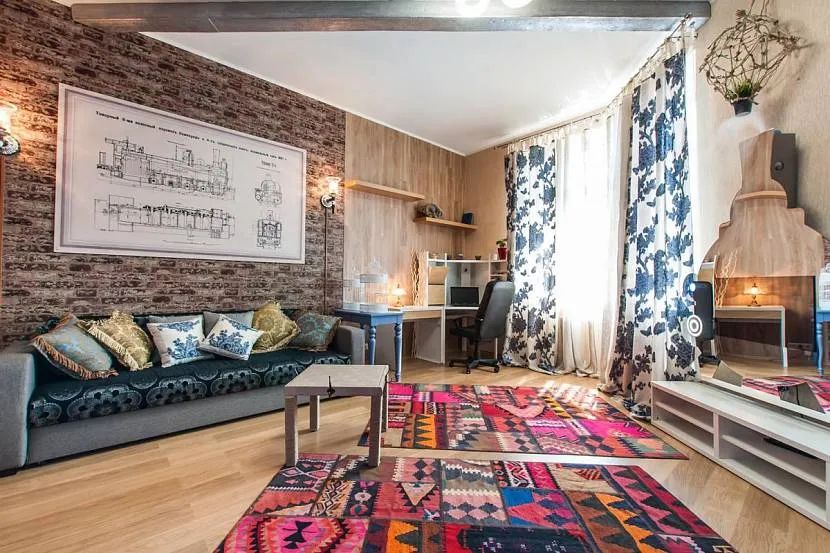 Текстиль является важной составляющей интерьера. Короткие шторы с вышивкой на окнах сделаны из хлопка. На мебели обязательны скатерти, кружевные салфетки. Ковры помогают визуально отделить зоны.